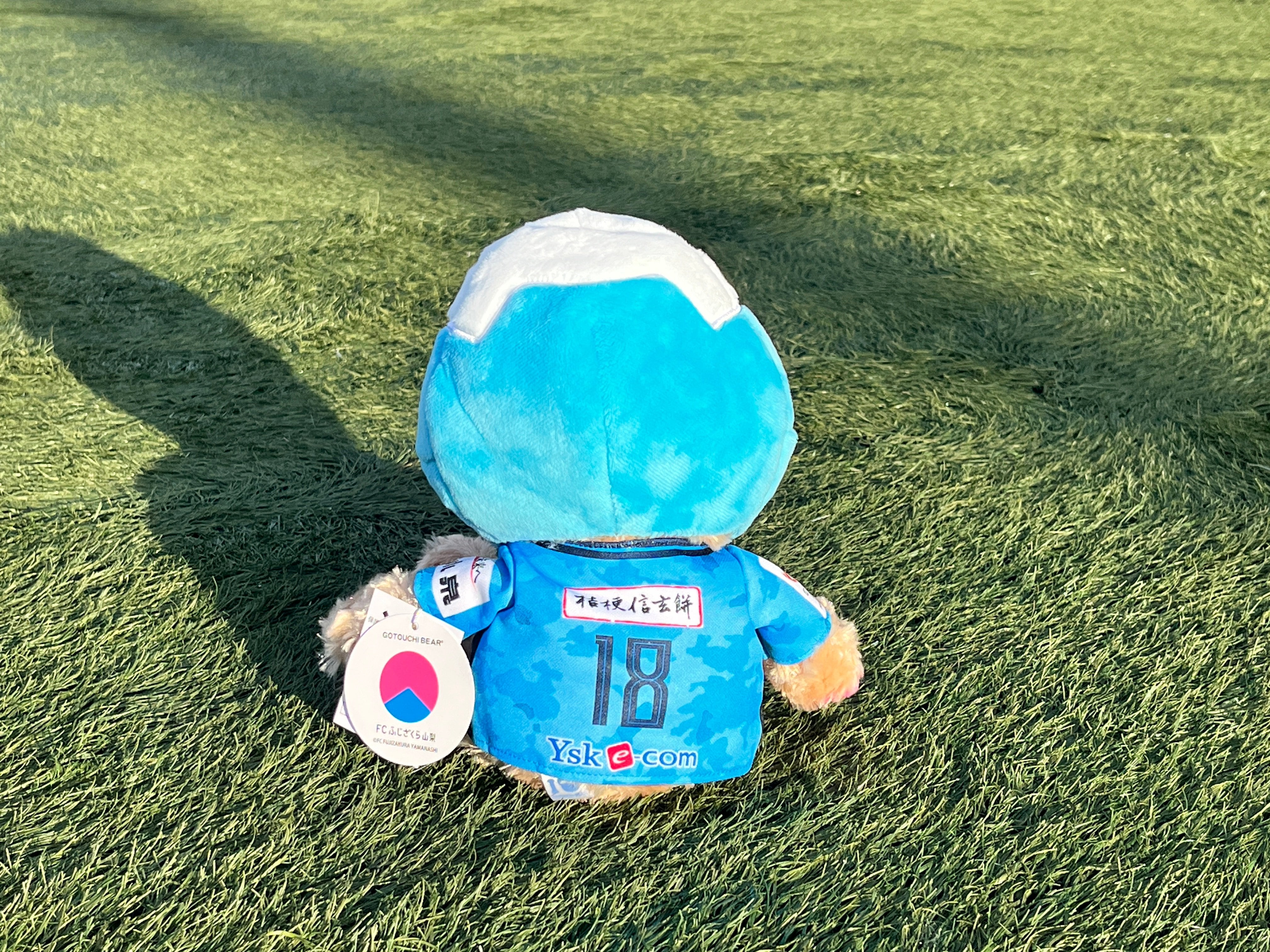 ふじざくらのユニフォームを着こなし、足の裏には「ふじざくらロゴ」と「GO WITH YOU」の文字が。