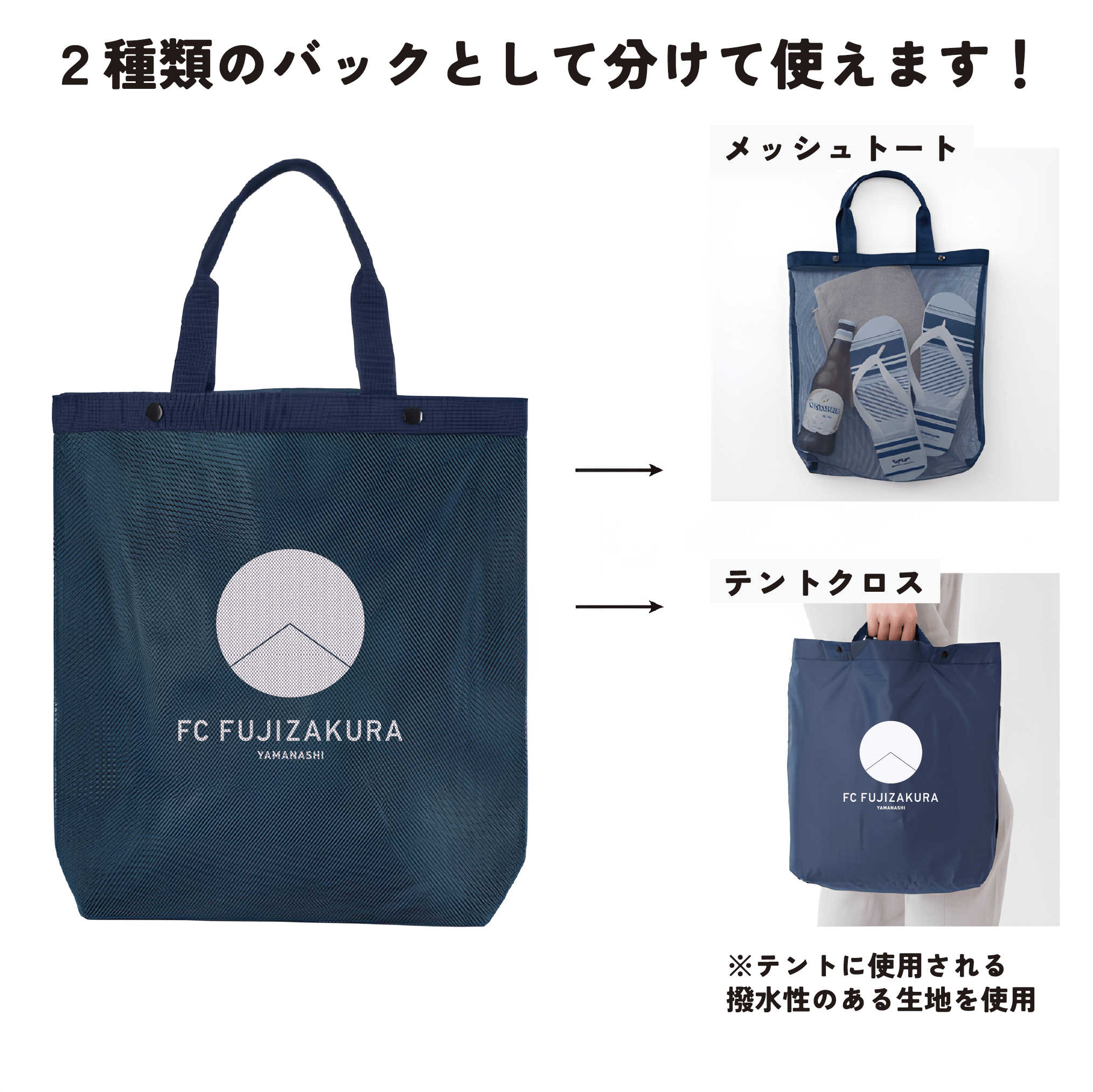 軽くてかさばらないメッシュトートと、テントに使用される撥水性のある生地で汚れを防ぐテントクロストートがセットになった2WAYバッグです。レジャーシート専用バッグとしてもおすすめ!