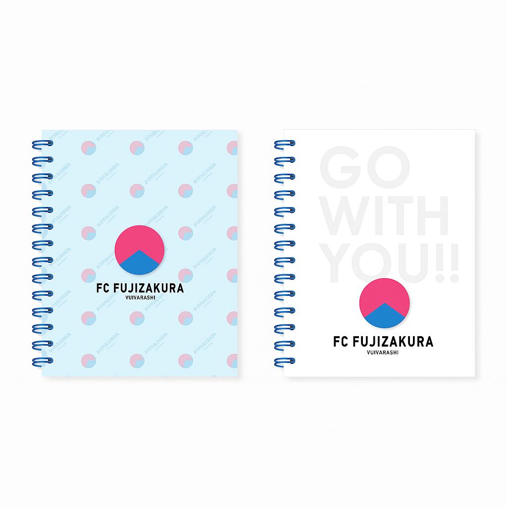 ポップなロゴデザイン(ブルー)とシンプルなロゴデザイン(ホワイト)のオリジナルノート。