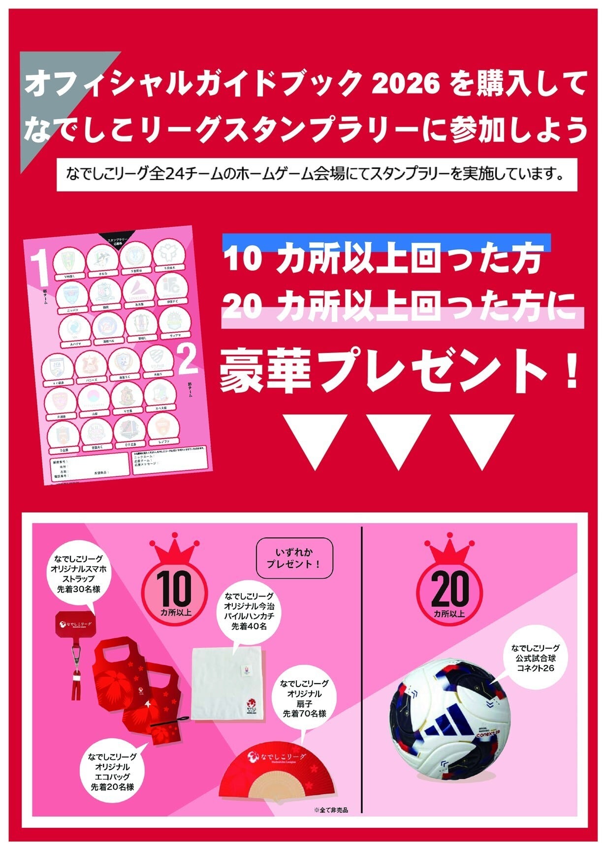 巻末にはなでしこリーグの試合会場で行っているスタンプラリーの台紙も同封。スタンプを集めると豪華プレゼントがもらえます。